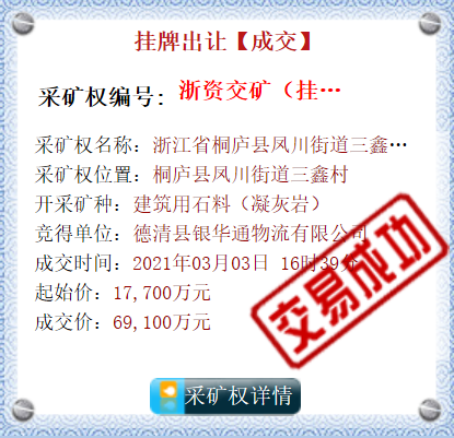 宇诚集团旗下子公司——德清县银华通物流有限公司,以6.91亿元竞得浙江省桐庐县凤川街道三鑫村竹桐坞矿地综合开发利用建筑用石料矿采矿权!